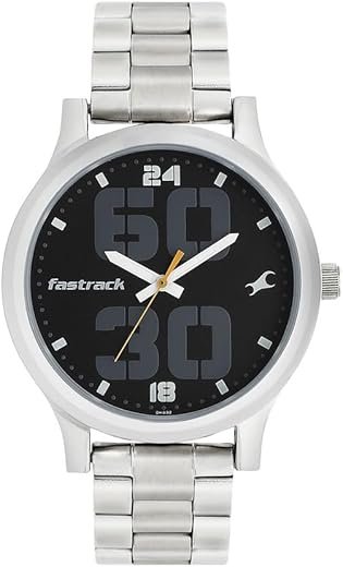 Make an unforgettable statement with this Fastrack Bold analog NT38051SM07. A striking black dial is enclosed in a robust metallic round case with an impressive thickness of 11.7 mm, protected by durable mineral glass. The watch displays time with contrast white baton indices at 5-minute intervals. The 6 and 12 hour marker positions boldly indicate time in 24-hours and also minutes with a unique combination of opaque and faded grey Arabic numerals. Two crisp white hands and a vibrant orange second hand ensure easy readability. A sleek stainless steel oyster strap secures this head-turning timepiece on your wrist with a deployment clasp. You’ve got to love it !